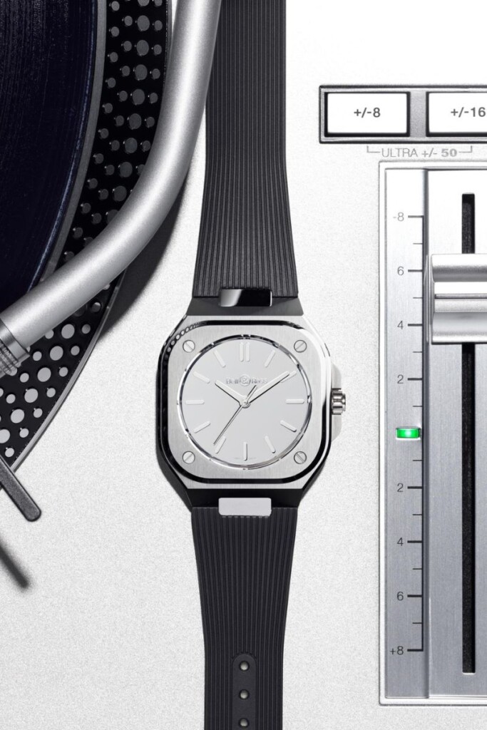 El BR-05 Grey Mirror Steel posee una caja de 40 mm, con un grosor de solo 10,5 mm, alberga un movimiento mecánico automático de alto rendimiento, el calibre BR-CAL.321-1, con una reserva de marcha de 54 horas.