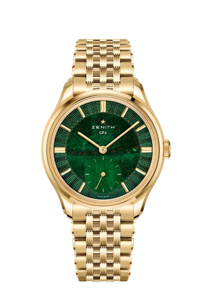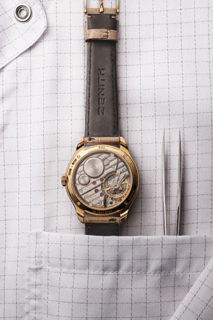 Un sector periférico guilloché, inspirado en la fachada de ladrillo de la Manufactura ZENITH en Le Locle, rinde un sutil homenaje a la visión verticalmente integrada de Georges Favre-Jacot.