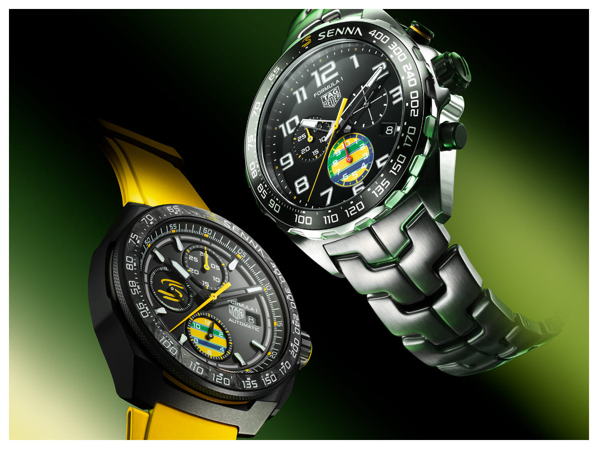 Uno de estos relojes es el Formula 1 Chronograph x Senna de 44 mm. Su diseño se inspira en el casco de Senna y su identidad brasileña. Esta diseñado con una esfera negra con efecto de rayos de sol realzada con vibrantes detalles, como una subesfera a las 6 en punto con los colores de la bandera nacional, un contador de cronógrafo de 30 minutos a las 12 con aguja lacada en amarillo y un contador de segundos a las 9 con el logotipo amarillo en forma de “S”, mientras que una aguja central de segundos lacada en amarillo recorre la esfera con gran precisión.