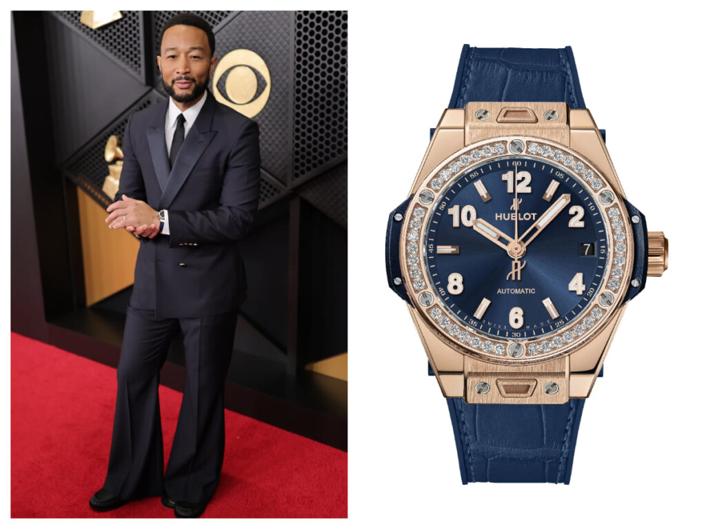 Uno de los infaltables en las alfombras rojas es el cantante John Legend. El cantante combinó su traje azul marino de custom Louis Vuitton con una pieza de Hublot: el Big Bang Original King Gold Blue Diamond.