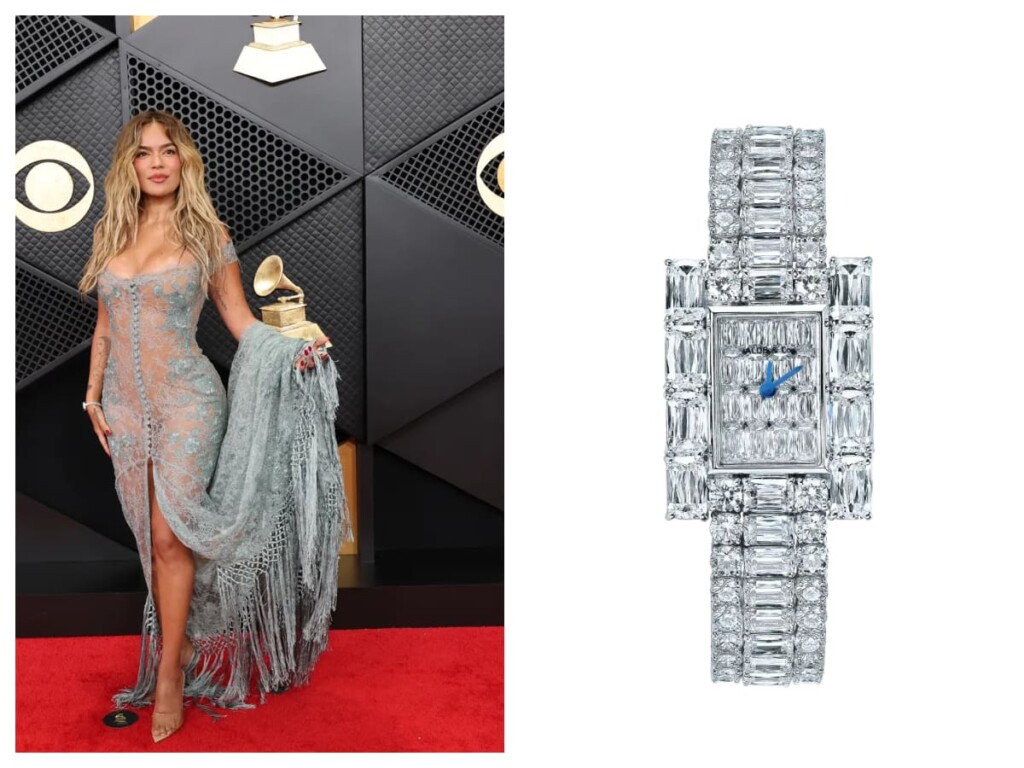 Las mujeres también se lucieron con piezas de alta relojería. Karol G es un ejemplo perfecto. La estrella colombiana lució un hermoso vestido azul con transparencias firmado por Paolo Sebastian, y una joya en su muñeca.