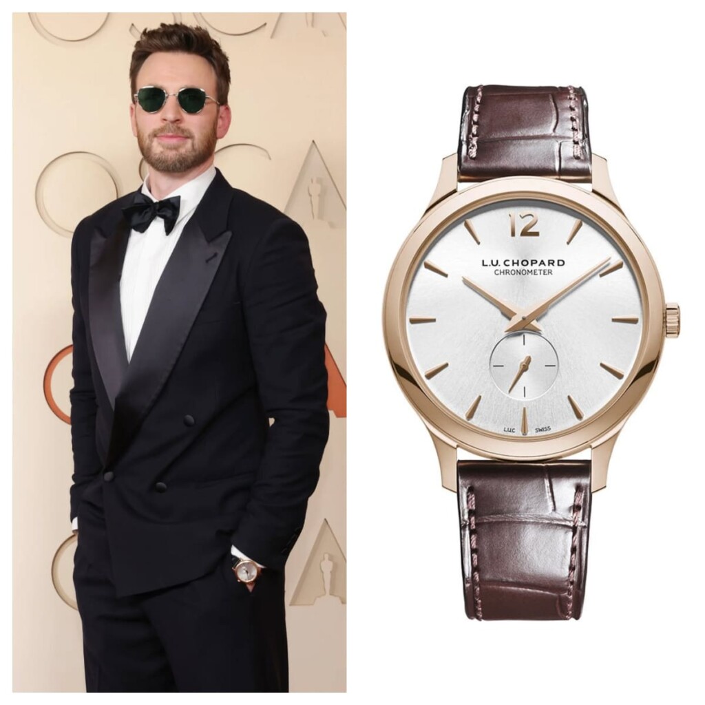 El Capitán América apostó por la sofisticación de Giorgio Armani, luciendo un esmoquin (tuxedo) azul marino oscuro (navy) con solapas de pico en satén negro. En su muñeca llevó una pieza de Chopard: el L.U.C XPS, elaborado con una caja de oro rosa de 18 quilates. El modelo XPS destaca por ser ultraplano. Esto es clave para una alfombra roja, ya que permite que el reloj se deslice suavemente bajo el puño de la camisa sin crear bultos antiestéticos, manteniendo la línea impecable del traje.