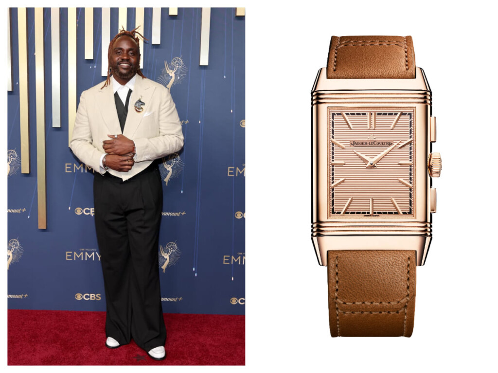 Brian Tyree Henry, nominado como mejor actor en una serie limitada, con un traje de Maison Bontemps Tux y joyas de Elizabeth Cage y un reloj de Jaeger -LeCoultre. Hablamos del Reverso Tribute Chronograph están decorados en oro rosa. Bajo la esfera completamente en oro de la parte frontal, el sofisticadísimo reverso deja ver el funcionamiento del cronógrafo con su contador retrógrado de 30 minutos.