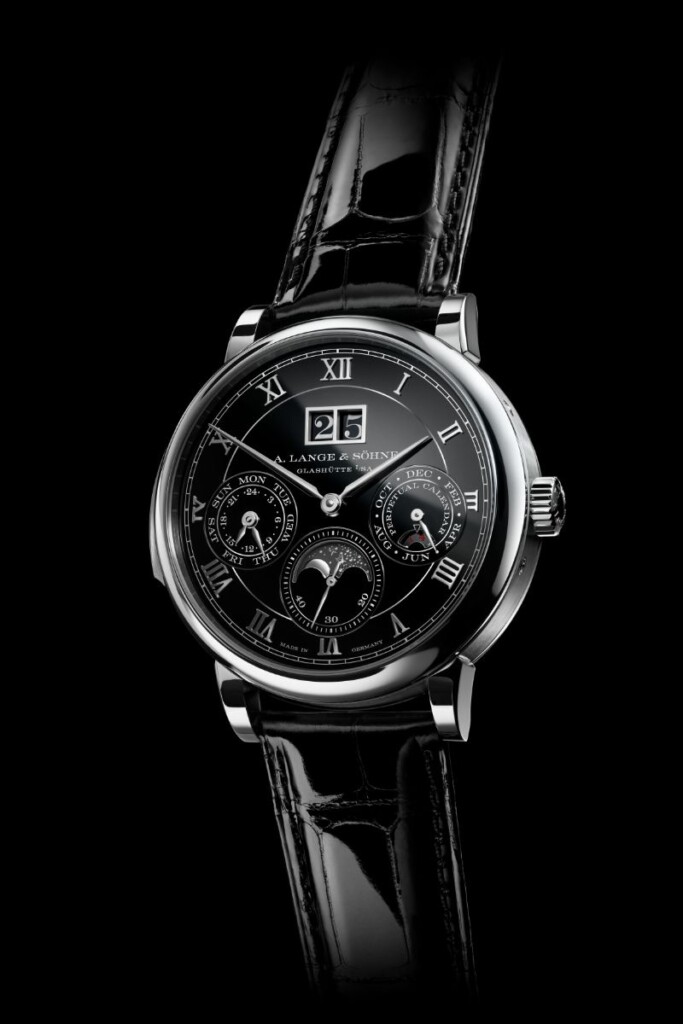 De oro blanco, está rellena de esmalte negro. La impecable superficie negra brillante constituye un elegante escenario para las indicaciones y la característica gran fecha de Lange, además de facilitar de forma óptima su consulta gracias a su contraste. En la esfera auxiliar situada a las 9 horas se encuentran las indicaciones del día de la semana y de las 24 horas; en la situada a las 3, las indicaciones del mes y del año bisisesto.