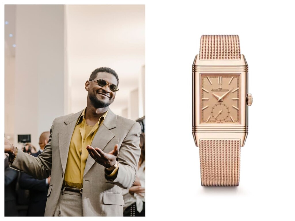 En su aparición, Usher lució principalmente el nuevo Jaeger-LeCoultre Reverso Tribute ‘Or Deco’ en oro rosa. Este modelo destaca por su brazalete de malla milanesa, también en oro rosa, que complementó su estilo refinado durante su recorrido por el pabellón de la marca.