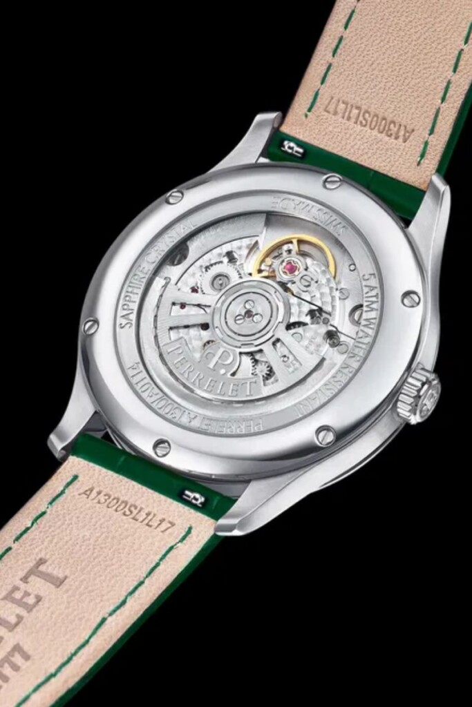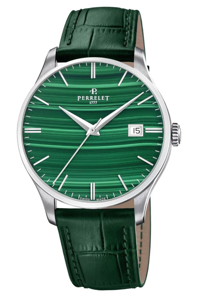 La malaquita era extremadamente popular en los relojes de lujo de los años 70 (como los Piaget o Rolex de la época). Perrelet la rescata con un diseño de caja mucho más limpio y actual.